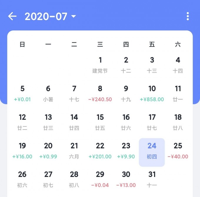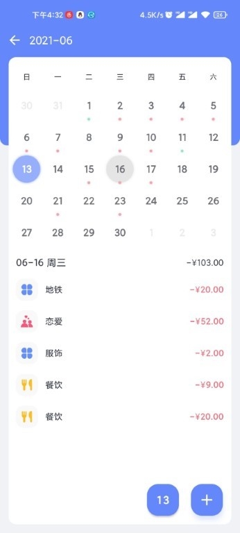 点击右下角+按钮,快速以日历选中的日期进行记账